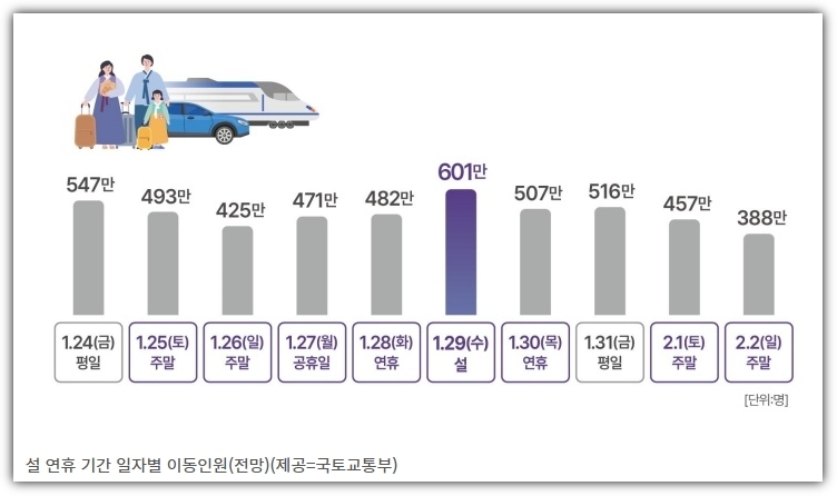 설 연휴 동안 언제 출발해야 덜 막힐지 눈치게임 중이시라면 1월 28일과 설날 다음 날인 1월 30일을 선호한다고 해요 이날은 피하시는게 좋을 듯 하죠? 미리 미리 계획하셔서 여유있게 출발하시를 바랍니다.
